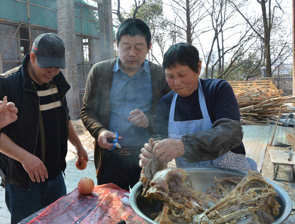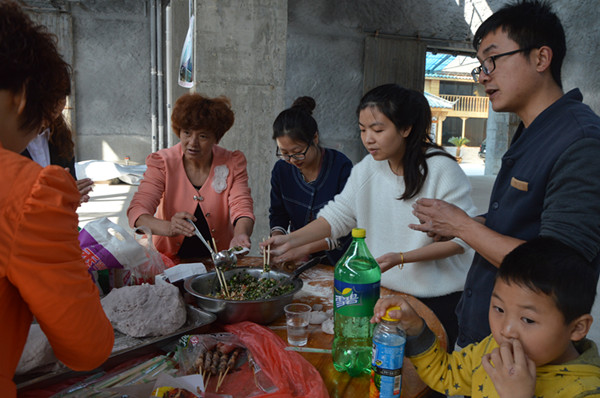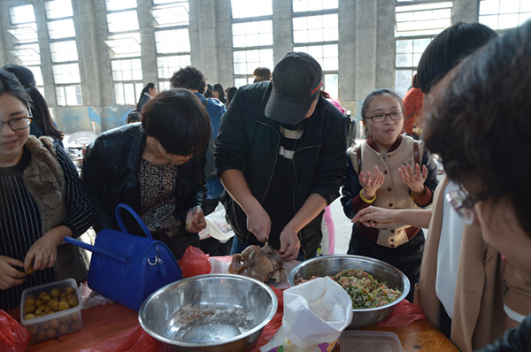 這邊包餃子的問(wèn)題正討論的激烈,那邊熱氣騰騰的豬頭也出鍋了?!把剑@么大的豬頭,小時(shí)候過(guò)年的感覺(jué)”?!皩?duì)啊,對(duì)啊,這種氣氛,這種味道,太有紀(jì)念意義了”。“來(lái)來(lái)來(lái),我拍張照片,微信朋友圈曬一曬”。黃色餃子、綠色餃子、紅色餃子、紫色餃子相繼的出鍋了,燒烤的食品也相繼出爐,大家互相品評(píng),因?yàn)槎际亲约簞?dòng)手參與,一切都變成了美食。